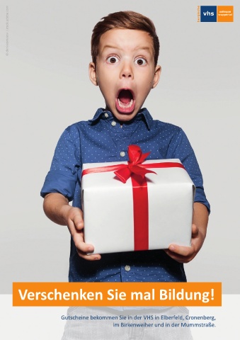 © deniskomarov | stock.adobe.com Verschenken Sie mal Bildung! Gutscheine bekommen Sie in der VHS in Elberfeld, Cronenberg, im Birkenweiher und in der Mummstraße.